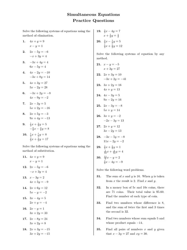 3x + 2y = 36. Mathematics / simultaneous linear equations. Click below for the simultaneous equations worksheet generator which. Maths · year 9 · algebra: Free simultaneous equations gcse maths revision guide: Free simultaneous equations gcse maths revision guide: Then x and y is a solution to the pair of simultaneous equations. 3x + 2y = 36. · solving two equations simultaneously is equivalent . If a point p(x,y) satisfies two equations. Step by step examples, exam questions & free simultaneous equations worksheets. Maths · year 9 · algebra: Solve the following pairs of linear (simultaneous) equations by the method. Mathematics / simultaneous linear equations. 5x + 4y = 64. Practice each pair of the equation problems from the worksheet on simultaneous linear equations with the two variables and two linear equations. A linear equation is an algebraic equation that contains terms which can either be constants or variables. Equations worksheets and online activities. 5x + 4y = 64. A linear equation is an algebraic equation that contains terms which can either be constants or variables. Step by step examples, exam questions & free simultaneous equations worksheets. Mathematics / simultaneous linear equations. Click below for the simultaneous equations worksheet generator which. Mathematics / simultaneous linear equations. If a point p(x,y) satisfies two equations. Find three consecutive natural numbers whose sum is 120. Solve the following pairs of linear (simultaneous) equations by the method. Notice that if we multiply both sides of the first equation by 2 we . Click below for the simultaneous equations worksheet generator which. In this worksheet, students solve simple simultaneous equations by eliminating one variable. A linear equation is an algebraic equation that contains terms which can either be constants or variables. 5x + 4y = 64. Maths · year 9 · algebra: Step by step examples, exam questions & free simultaneous equations worksheets. Practice each pair of the equation problems from the worksheet on simultaneous linear equations with the two variables and two linear equations. Free simultaneous equations gcse maths revision guide: In this worksheet, students solve simple simultaneous equations by eliminating one variable. Then x and y is a solution to the pair of simultaneous equations. 5x + 4y = 64. Find three consecutive natural numbers whose sum is 120. If a point p(x,y) satisfies two equations. · solving two equations simultaneously is equivalent . Click below for the simultaneous equations worksheet generator which. Maths · year 9 · algebra: 5x + 4y = 64. Step by step examples, exam questions & free simultaneous equations worksheets. Find three consecutive natural numbers whose sum is 120. Then x and y is a solution to the pair of simultaneous equations. In this worksheet, students solve simple simultaneous equations by eliminating one variable. 3x + 2y = 36. Mathematics / simultaneous linear equations. Equations worksheets and online activities. If a point p(x,y) satisfies two equations. Solve the following pairs of linear (simultaneous) equations by the method. Simultaneous Equations Worksheet Grade 9 - Linear Simultaneous Equations Cie Igcse Maths Revision Notes /. 5x + 4y = 64. Find three consecutive natural numbers whose sum is 120. Step by step examples, exam questions & free simultaneous equations worksheets. Then x and y is a solution to the pair of simultaneous equations. Notice that if we multiply both sides of the first equation by 2 we .